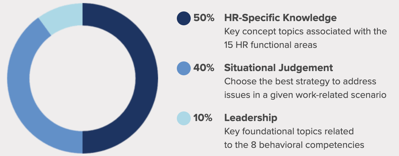 Approximately half of the items on each exam are allocated across the three behavioral competency clusters, and the other half are allocated across the three HR knowledge domains. For more information, please review the SHRM BASK™.